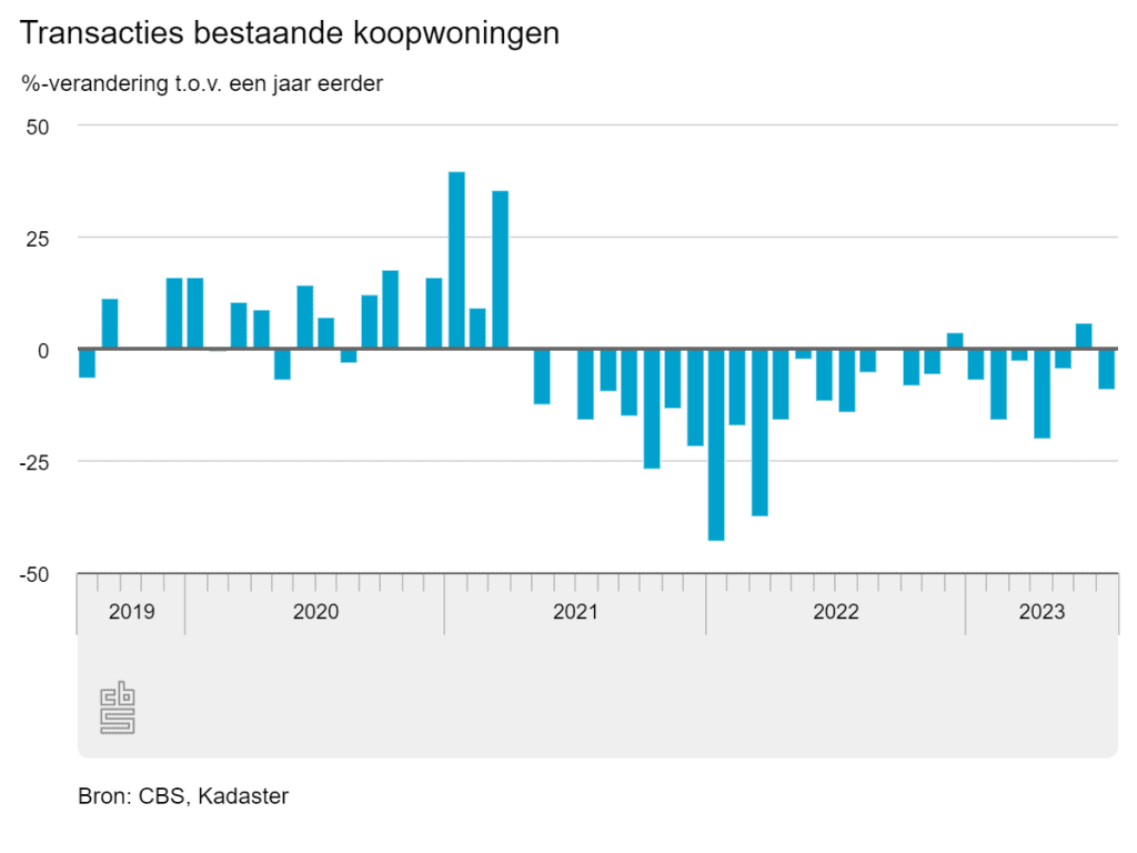 Het gebrek aan woningen op de markt wordt ook duidelijk weerspiegeld in het aantal verkochte huizen. Het Kadaster meldt dat er in juli 14.925 woningtransacties zijn geregistreerd, wat ruim negen procent minder is dan een jaar eerder. In de eerste zeven maanden van dit jaar zijn er 99.862 woningen verkocht, ruim zeven procent minder dan in dezelfde periode in 2022.